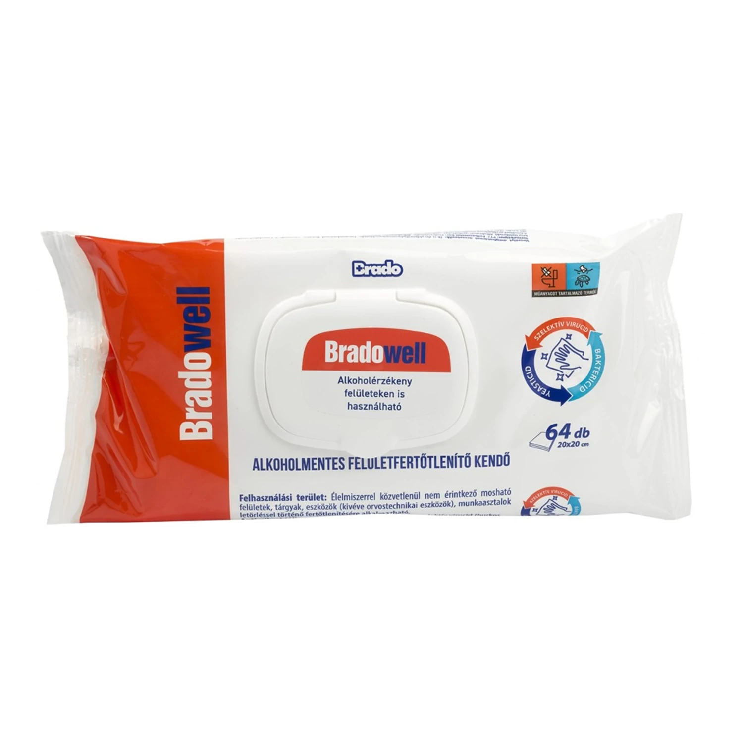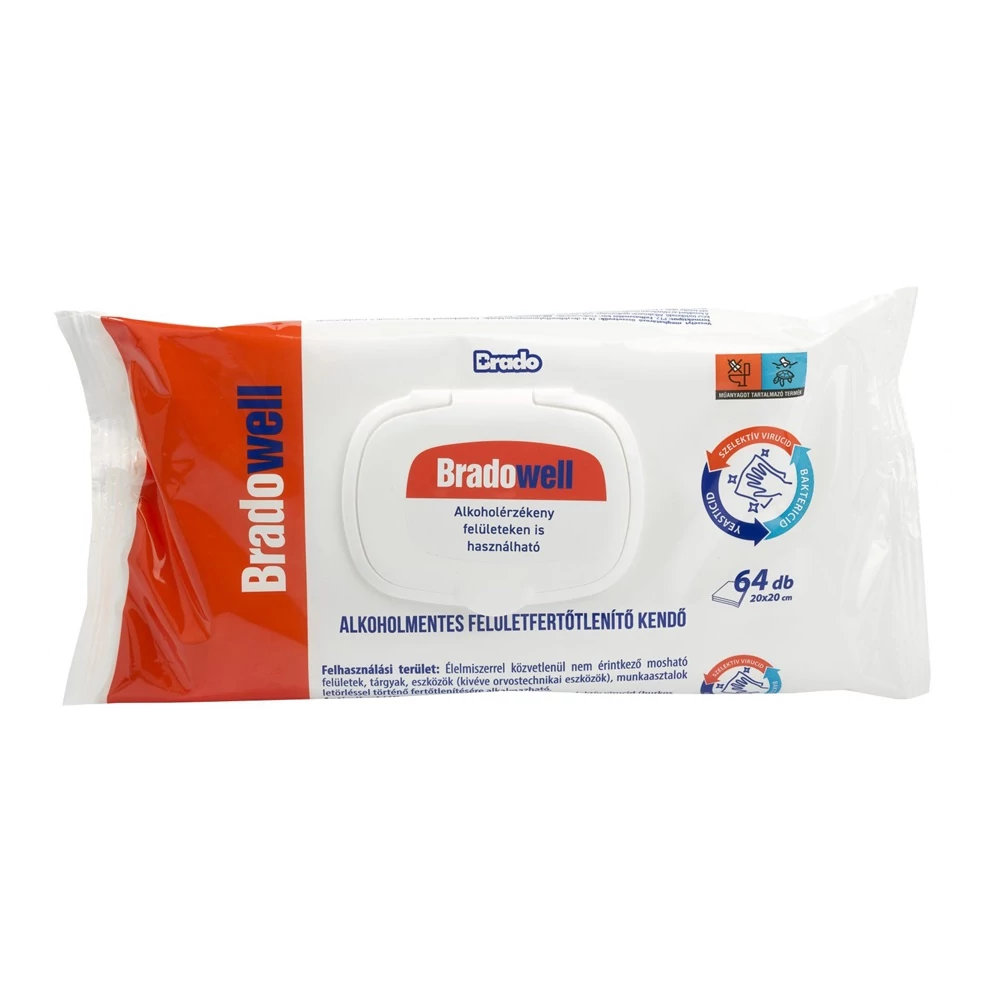 Nedves törlőkendő fertőtlenítő hatással 64 lap/csomag alkoholmentes Bradowell