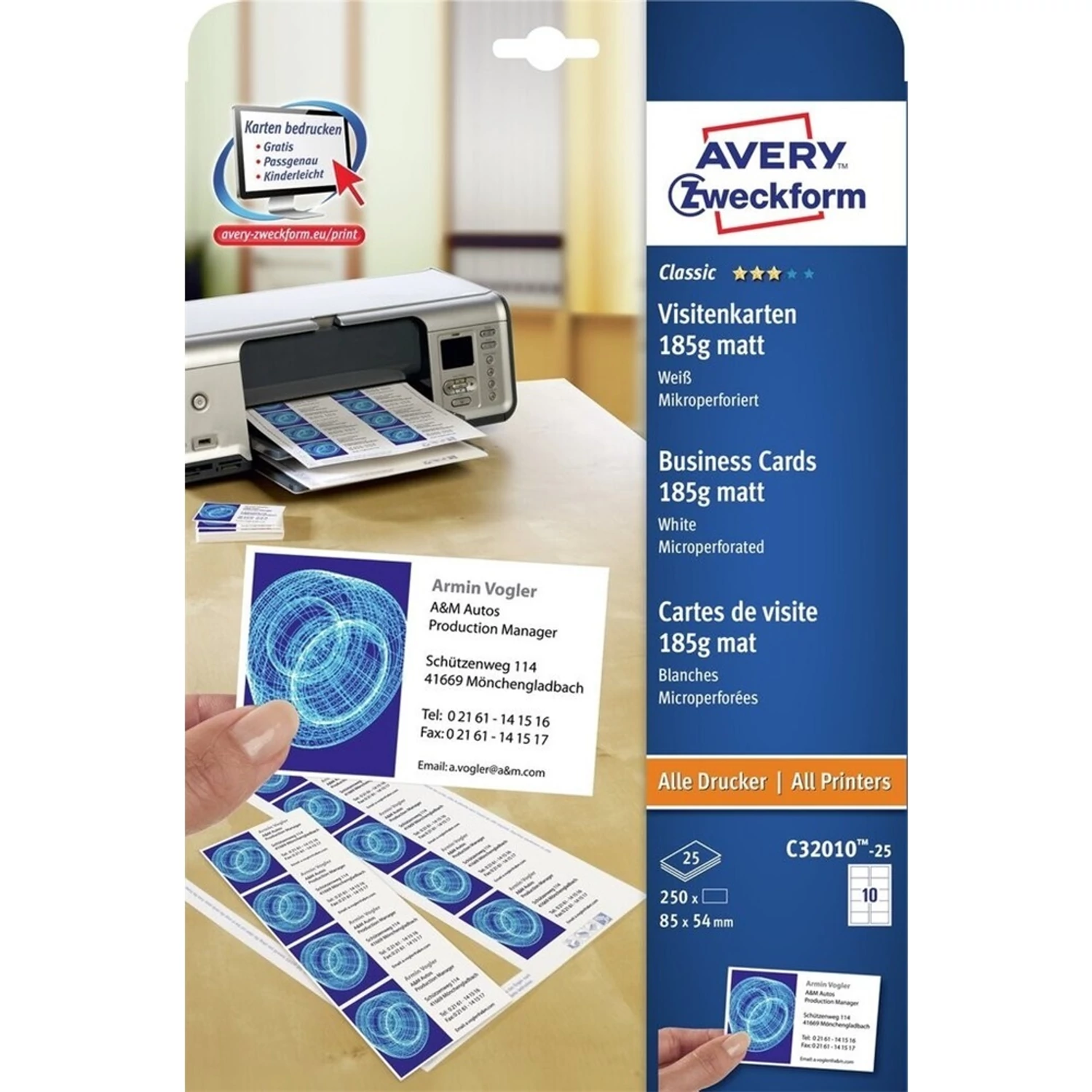 Névjegykártya, mikroperforált élekkel, kétoldalas 185g-os, 25 db, Avery matt fehér