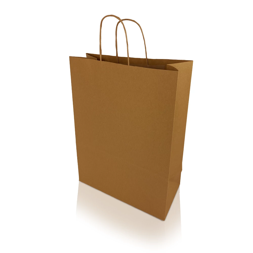 A sodrottfüles papírtáska 320×420×150 mm-es méretben megbízható, környezetbarát és gazdaságos választás mindazoknak, akik a praktikumot és a fenntarthatóságot keresik. A 200 darabos kiszerelés ideálissá teszi nagyobb forgalmú vállalkozásoknak is. A bordázott barna felület elegáns, mégis természetközeli megjelenést nyújt, amely könnyen alakítható a céged arculatához.