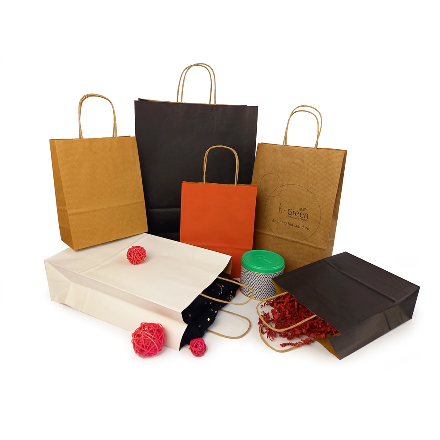 Válassza a fenntarthatóságot kiskereskedelmi üzlete számára! h-Green egy 100%-ban újrahasznosítható papírtáska termékcsalád, újrahasznosított papírból! h-Green a fenntartható termék! h-Green úgy lett kialakítva, hogy a termék életciklusának minden szakaszában korlátozza a környezetre gyakorolt hatását. Újrahasznosított nátronpapírból készül, FSC® tanúsítvánnyal rendelkezik, ellenálló és 100%-ban újrahasznosítható. A felhasznált tinták vízbázisúak és természetes pigmentekkel készülnek, ásványi olajok nélkül. A ragasztók nem tartalmaznak veszélyes vegyi anyagokat az újrahasznosítás megkönnyítése érdekében. Kifejezetten a kiskereskedelmi üzletek számára készült táska három méretben és négy színben kapható. S, M és L méret négy színben elérhető: fehér, piros, fekete és bordázott barna. Katalóguskód: 42259 Hiteles tájékoztatás: Elkötelezettek vagyunk termékeink biztonságának garantálásáért, nyomon követjük a termékbiztonsággal kapcsolatos valamennyi európai uniós és hazai szabályozást és biztosítjuk termékeink azoknak történő megfelelését. Az EU 2023/988-as számú Általános Termékbiztonsági Rendeletét (GPSR) is alkalmazzuk, így ha a termékeink biztonságát illetően fogyasztóként kérdése, észrevétele van, vagy esetleg balesetről van tudomása, kérjük, írja meg nekünk.