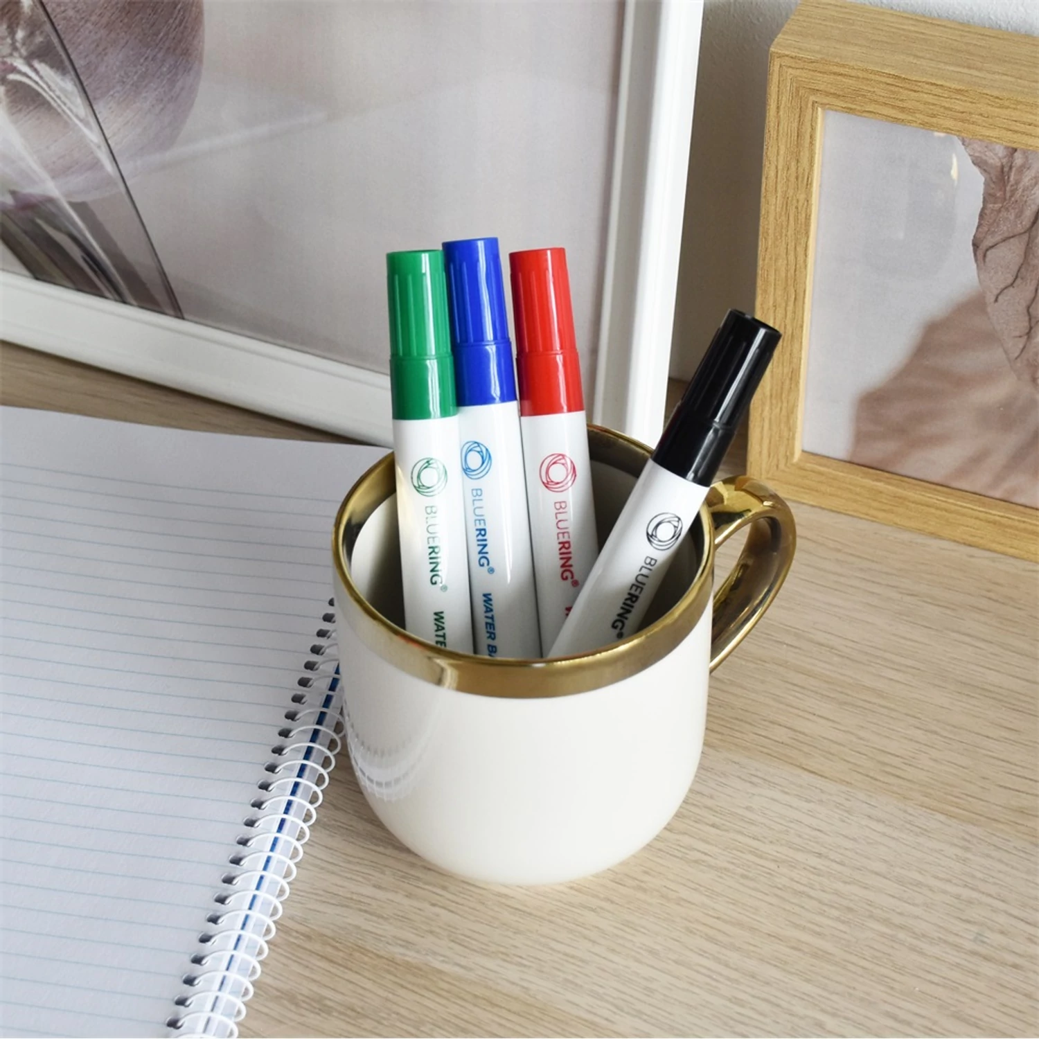 Írásképe vízálló, kerek csúccsal és légmentesen záró kupakkal. Test színe fehér, az írásszín egyértelmű megjelölésével. Készlet írásszínei: kék, fekete,piros, zöld.