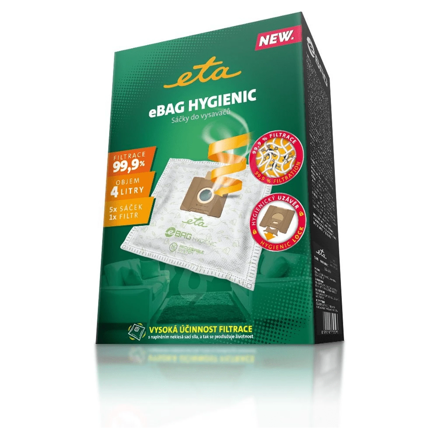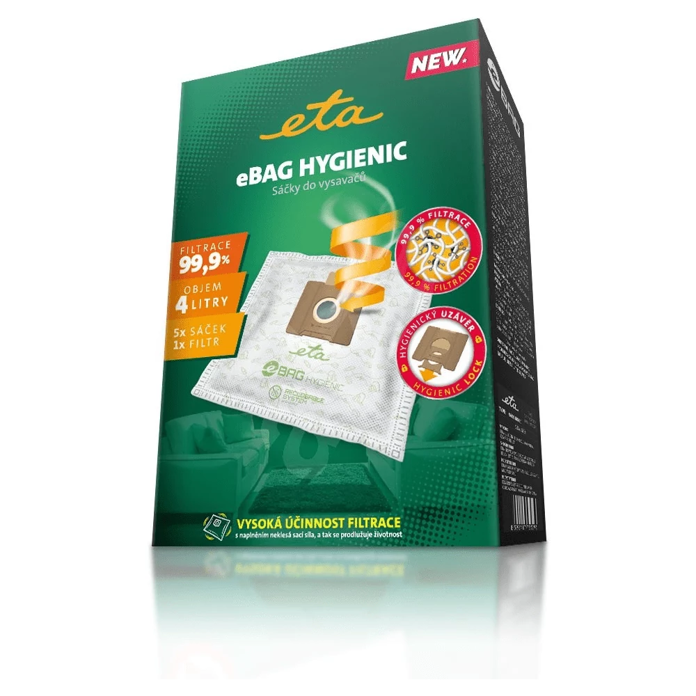 Higiénikusan lezárható, univerzális ETA eBAG HYGIENIC 9600 68010 porzsák szett, amely optimális tisztítási teljesítményt biztosít a porszívónak, állandó szívási teljesítmény mellett, amíg a zsák meg nem telik. A csomag tartalmaz 5 darab ETA zsákot, így a szett hosszú ideig kitart. Köszönhetően az ellenállóságának és az erősségének, az eBAG HYGIENIC zsákot nem fenyegeti a kiszakadás vagy egyéb kellemetlen baleset veszélye. A fejlett szűrőrendszernek köszönhetően még a legfinomabb porszemek is bent maradnak, így a házban mindig tökéletesen tiszta marad a levegő.