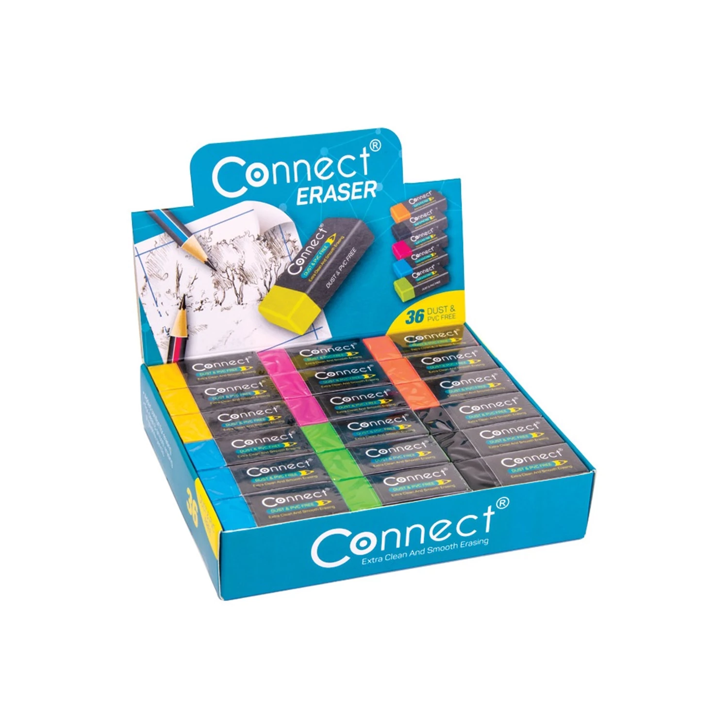 Radír Connect plasztik, 36 db/kínáló doboz 6x6szín,