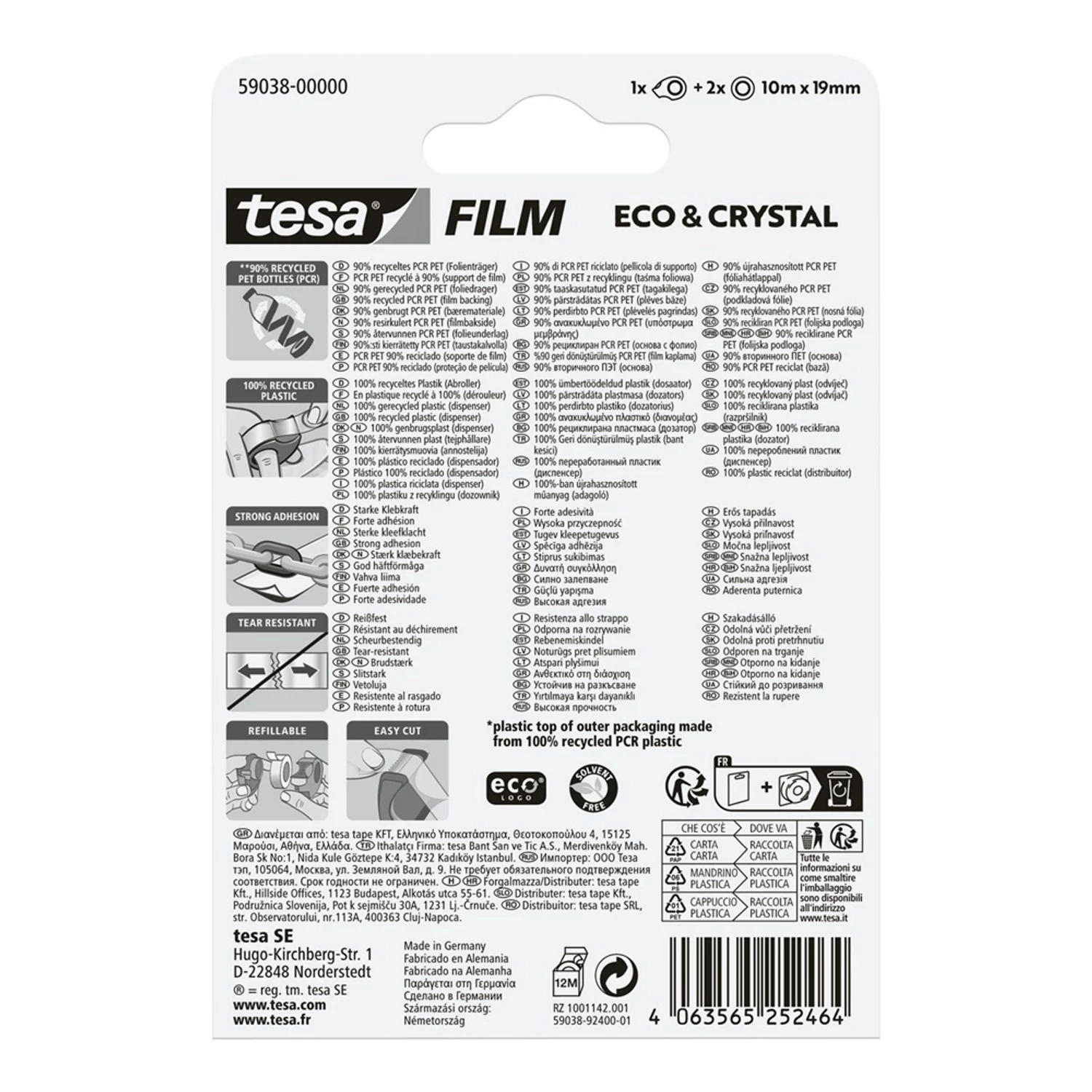 Bemutatjuk a tesafilm® Eco & Crystal szalagot, amely a klasszikus tesafilm® jól ismert tulajdonságait ötvözi a környezetbarát jellemzőkkel. Rendkívül átlátszó, sokoldalú, erős, oldószermentes ragasztóval, és 90%-ban PET-palackok újrahasznosításából származó műanyagból készült hordozóanyaggal. Ezenkívül a tekercs magja 100%-ban újrahasznosított műanyagból készül, és csendesen letekerhető. Az összes tesafilm® szalagadagolóval kompatibilis. Hiteles tájékoztatás: Elkötelezettek vagyunk termékeink biztonságának garantálásáért, nyomon követjük a termékbiztonsággal kapcsolatos valamennyi európai uniós és hazai szabályozást és biztosítjuk termékeink azoknak történő megfelelését. Az EU 2023/988-as számú Általános Termékbiztonsági Rendeletét (GPSR) is alkalmazzuk, így ha a termékeink biztonságát illetően fogyasztóként kérdése, észrevétele van, vagy esetleg balesetről van tudomása, kérjük, írja meg nekünk. GPSR: TESA SE Headquarter Europe Hugo-Kirchberg-Straße 1., 22848 Norderstedt, Germany tesa.Industrieinternetanfragen@tesa.com https://www.tesa.com/en