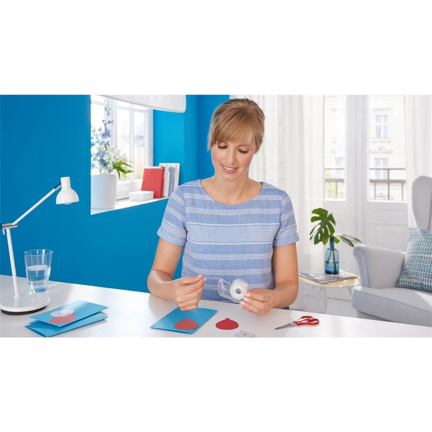 A 12 mm-es szélesség a “mindenre bevethető” kategória: elég keskeny ahhoz, hogy papíron, kartonon és kisebb felületeken is szépen dolgozz, de elég széles ahhoz, hogy stabilabb rögzítést adjon például borítékzáráshoz, fotók rögzítéséhez, dekor elemek felhelyezéséhez, poszterekhez (felületfüggően), vagy ajándékcsomagolásnál a takarásmentes rögzítéshez. A 7,5 méteres hossz jól tervezhető otthoni és irodai használatnál: nem “egy alkalmas” tekercs, de nem is túl nagy, így az adagolóval együtt kényelmesen tárolható fiókban.
