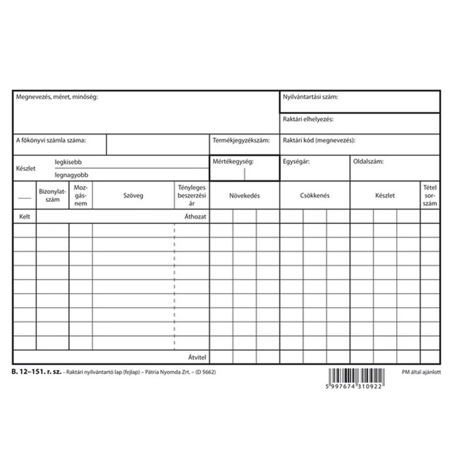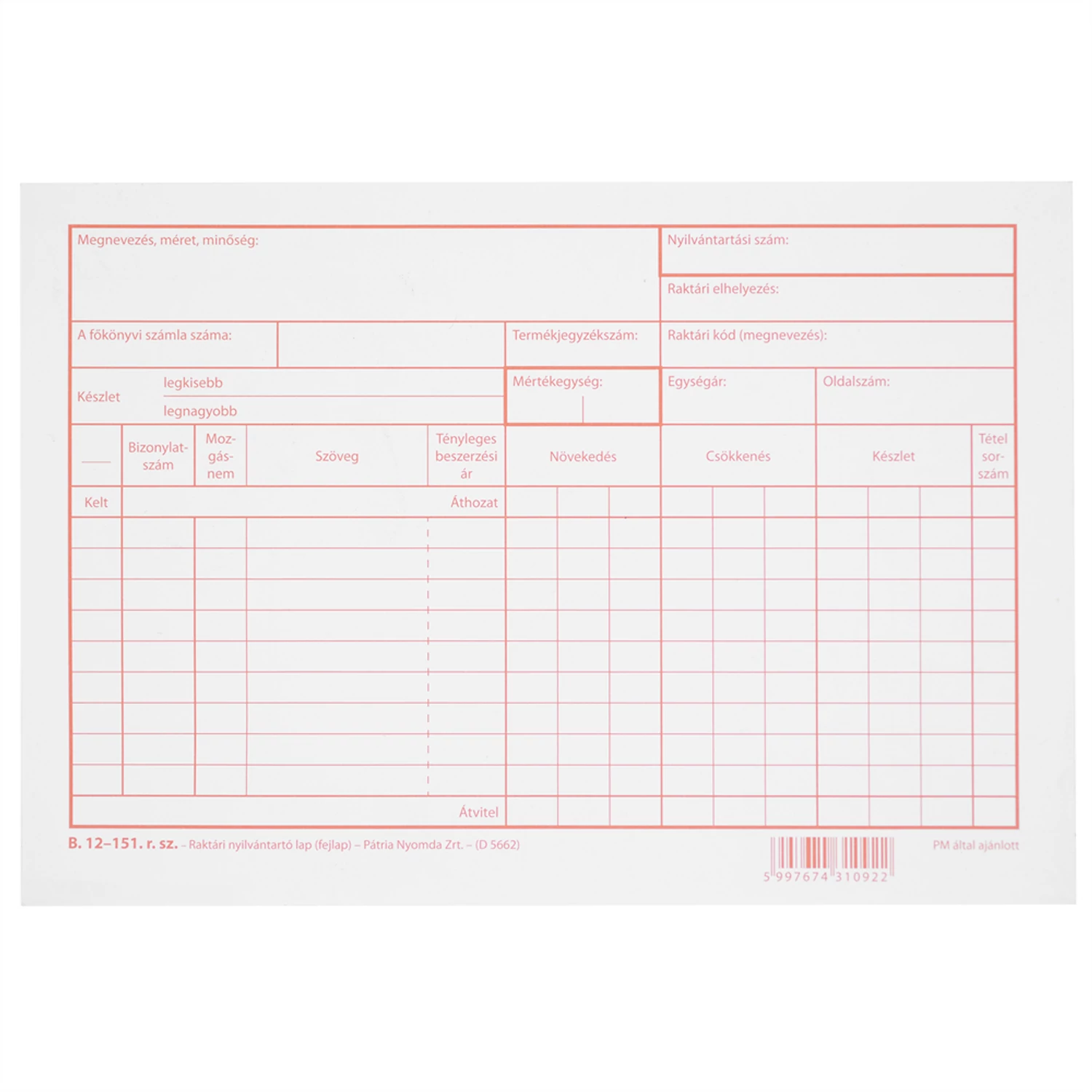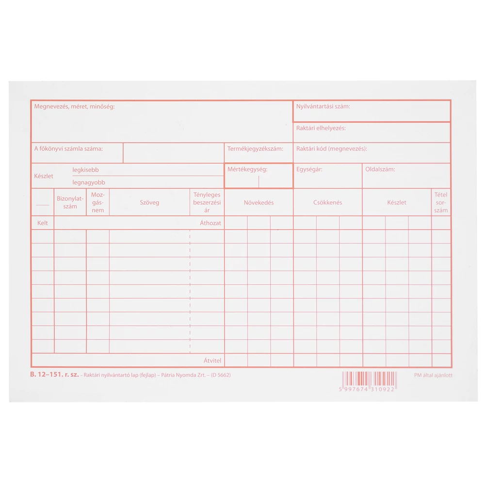 Raktárkészlet nyilvántartólap A5 B.12-151
