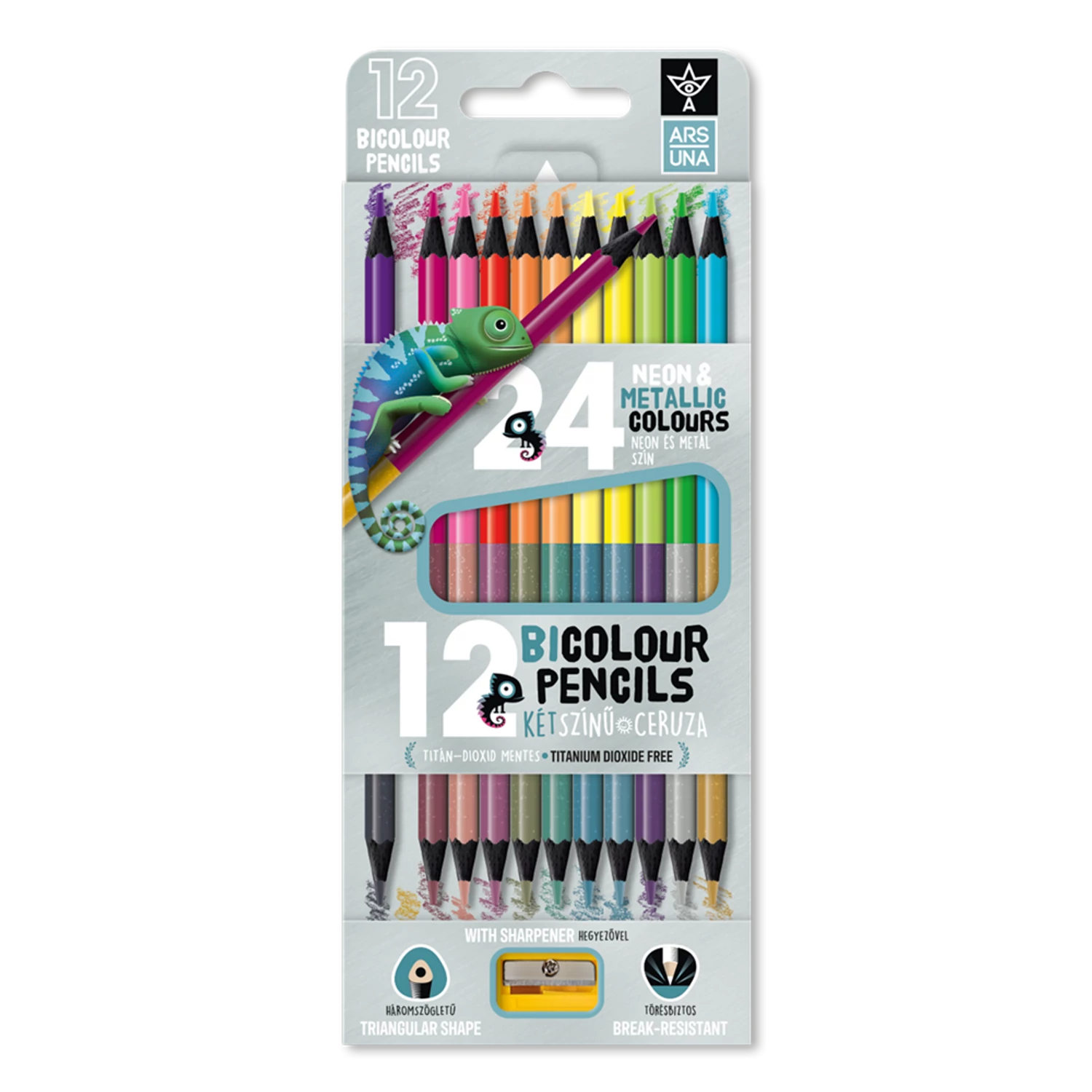 Háromszögletű bicolor neon/metál színes ceruzakészlet, törésálló 3,5 mm-es, TiO2 (titánium-dioxid) mentes ceruzabéllel. A bicolor kialakításnak köszönhetően a 12 db-os ceruzakészletben 24 szín található, a ceruza egyik oldala neon, a másik oldala metál színű. A készlet része egy kiváló minőségű hegyező is. A ceruzatest és a ceruzahegy színe megegyezik. Papír dobozban, a doboz EURO lyukkal ellátva. . Katalóguskód: 65852.