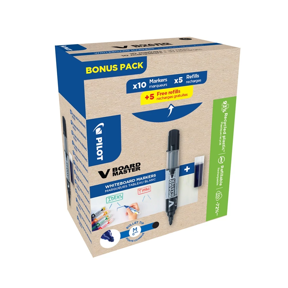 A Pilot márka világszerte ismert a megbízható minőségéről és a precíz technológiájáról. A V-Board Master széria a környezettudatosság és a teljesítmény egyensúlyát képviseli: 90%-ban újrahasznosított anyagból készül, mégis prémium írásképet nyújt.