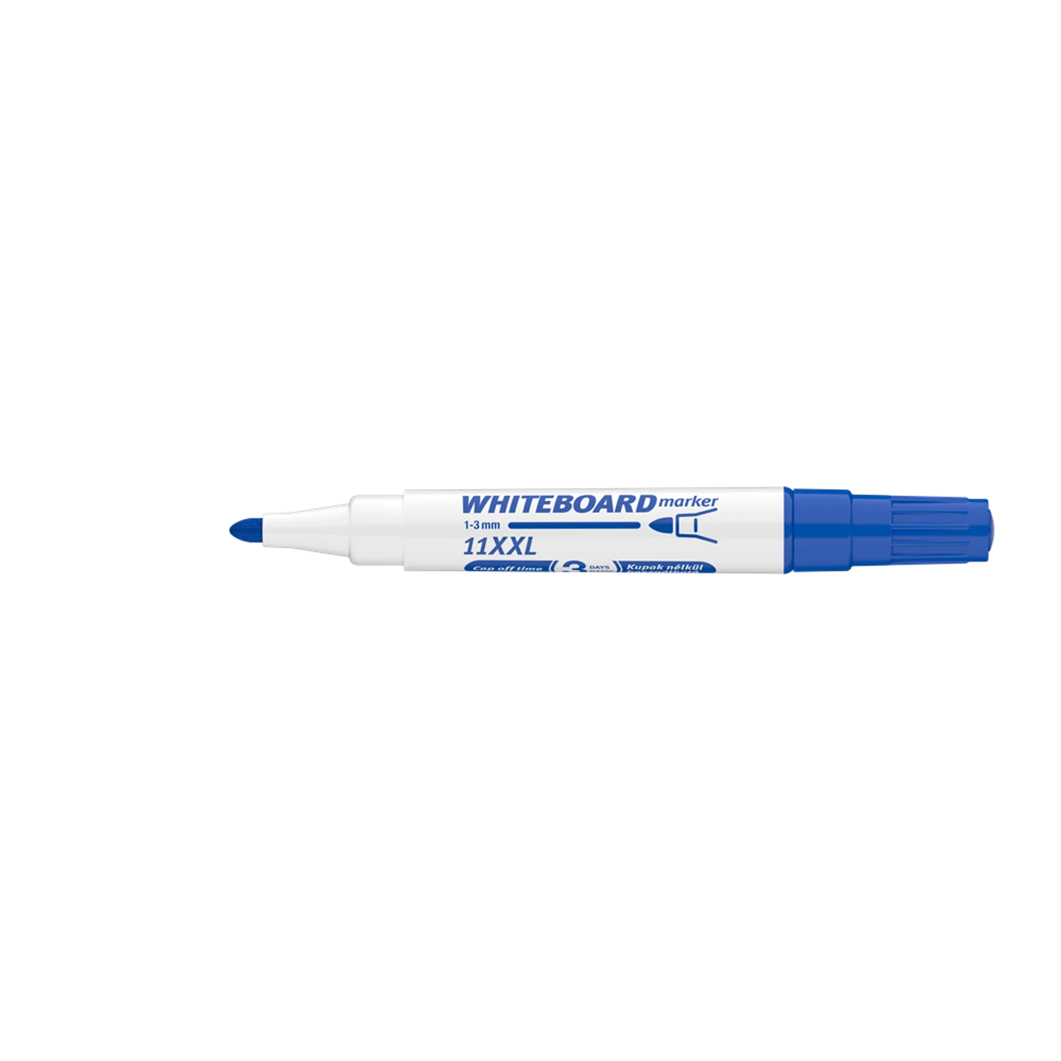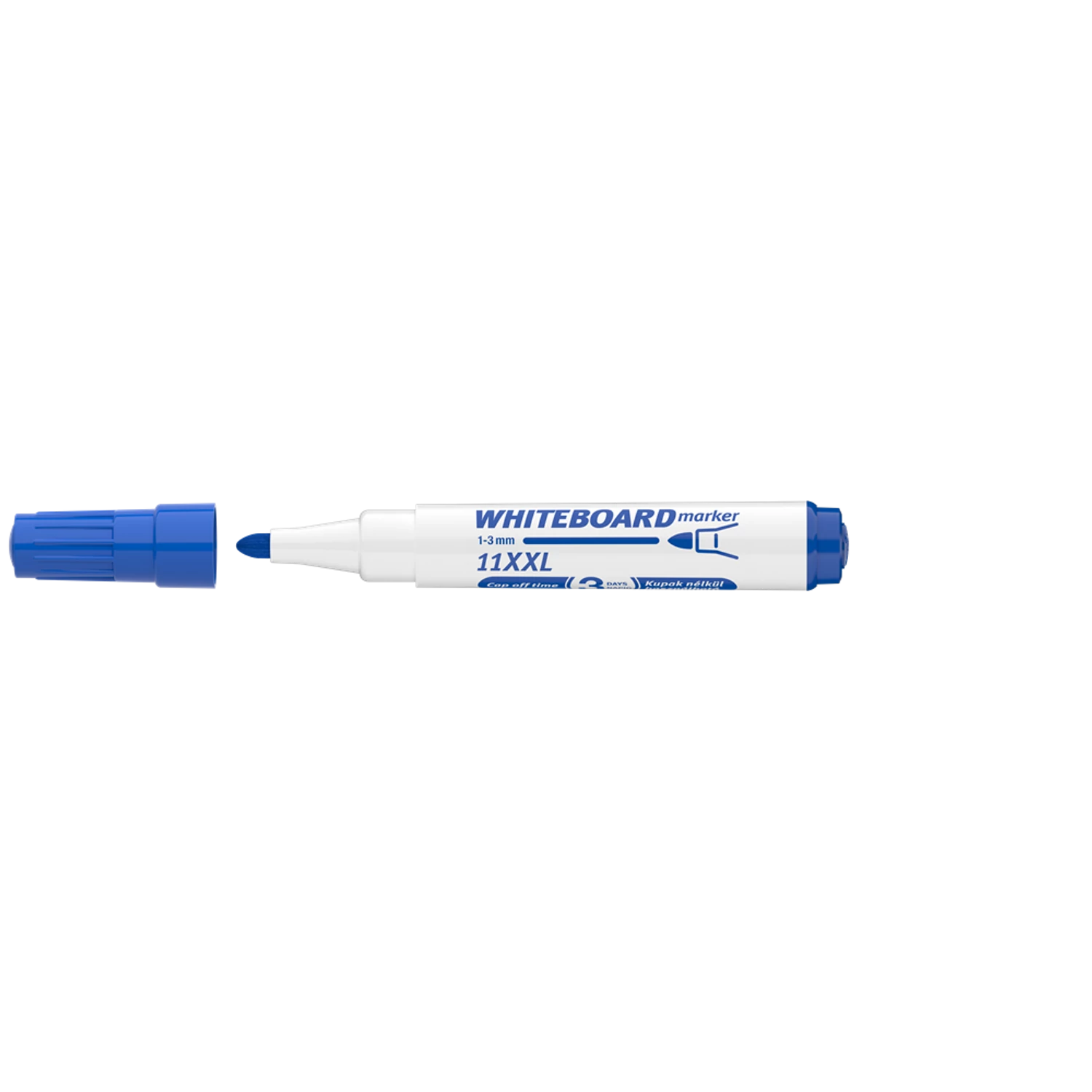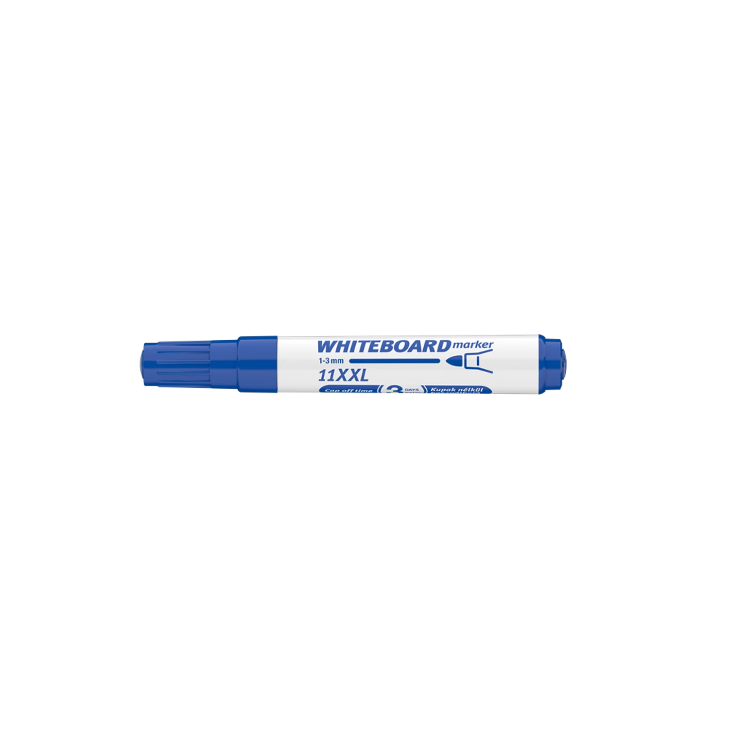 Az ICO 11XXL táblamarker kerek heggyel rendelkezik, amely kb. 3 mm-es vonalvastagságot tesz lehetővé. Ez a méret ideális általános íráshoz és egyszerűbb rajzokhoz, vázlatokhoz. A kék tinta jól látható, mégsem túl harsány, ezért hosszabb használat esetén sem fárasztó a szemnek.