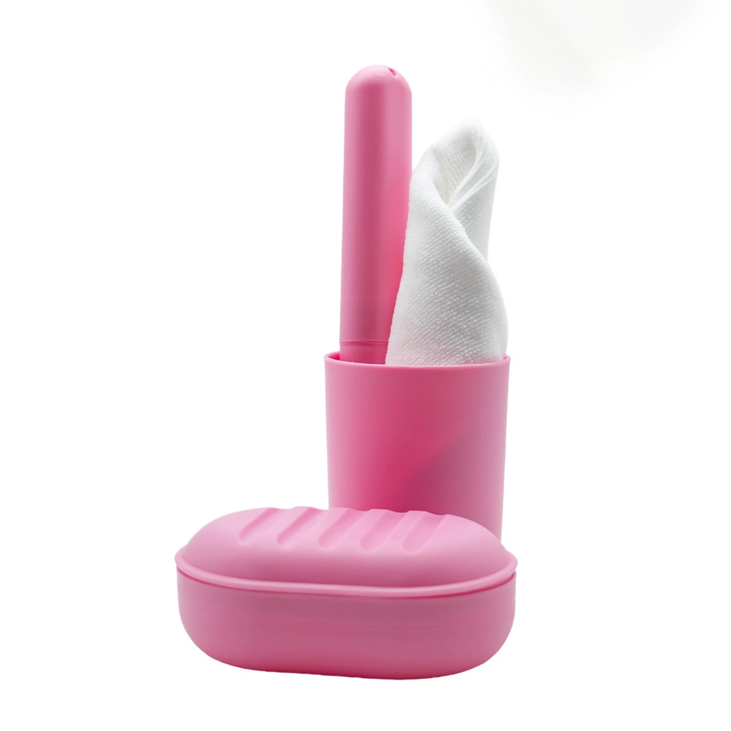 Tisztasági csomag összehúzható, zsinóros átlátszó zsákban. Tartalma: műanyag pohár, szappantartó, fogkefetartó, kéztörlő.