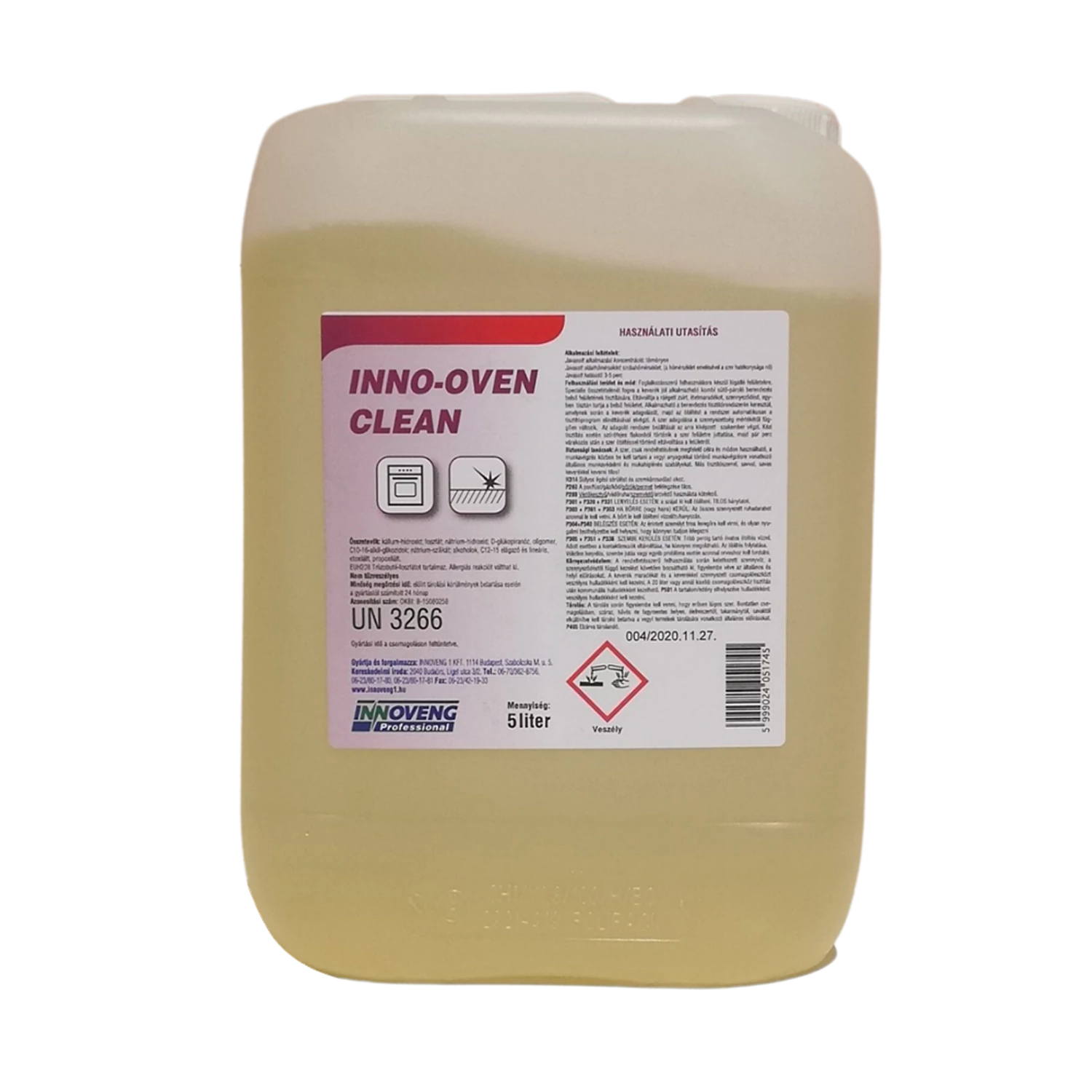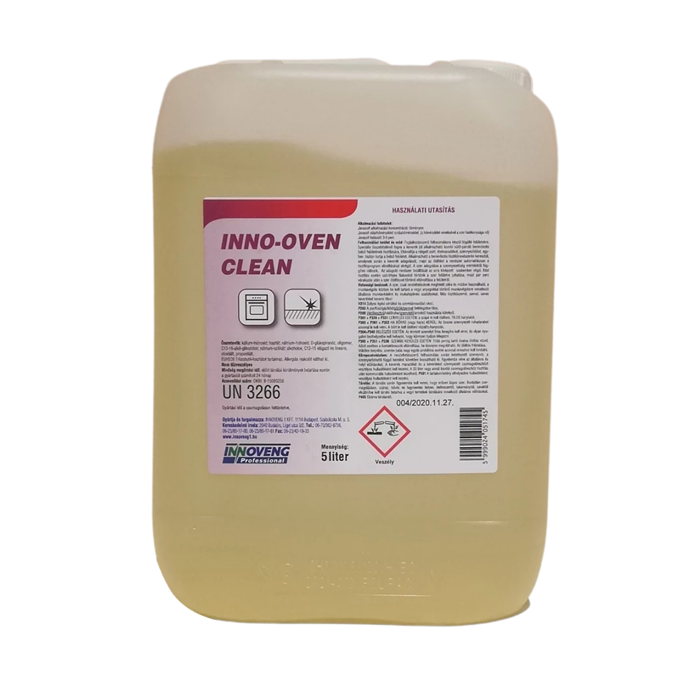 Felhasználási terület és mód: Foglalkozásszerű felhasználásra készül lúgálló felületekre. Speciális összetételénél fogva a keverék jól alkalmazható kombi sütő-pároló berendezés belső felületének tisztítására. Eltávolítja a ráégett zsírt és ételmaradékot, szennyeződést, egyben tisztán tartja a belső felületet. Alkalmazható a berendezés tisztítórendszerén keresztül, amelynek során a keverék adagolását, majd az öblítést a rendszer automatikusan a tisztítóprogram elindításával elvégzi. A szer adagolása a szennyezettség mértékétől függően változik. Az adagoló rendszer beállítását az arra kiképzett szakember végzi. Kézi tisztítás esetén szórófejes flakonból történik a szer felületre juttatása, majd pár perc várakozás után a szer öblítéssel történő eltávolítása a felületről. GHS piktogram: Figyelmeztetés: Veszély Figyelmeztető mondatok: H314 Súlyos égési sérülést és szemkárosodást okoz. Kiszerelés: 5 literes kanna Szavatossági idő: 24 hónap Tisztítószer sütő-pároló berendezésekhez 5 liter Inno-Oven Clean termék alkalmazásakor ügyeljen a biztonságra! Használat előtt mindig olvassa el a címkét és a használati útmutatót! Katalóguskód: 62160