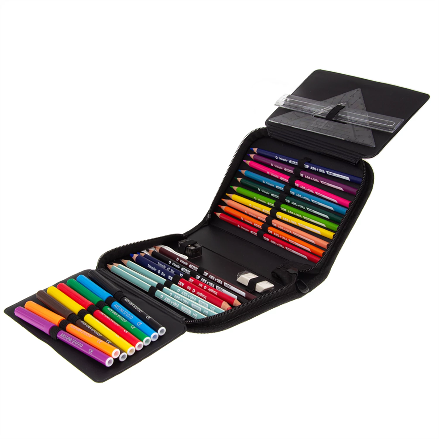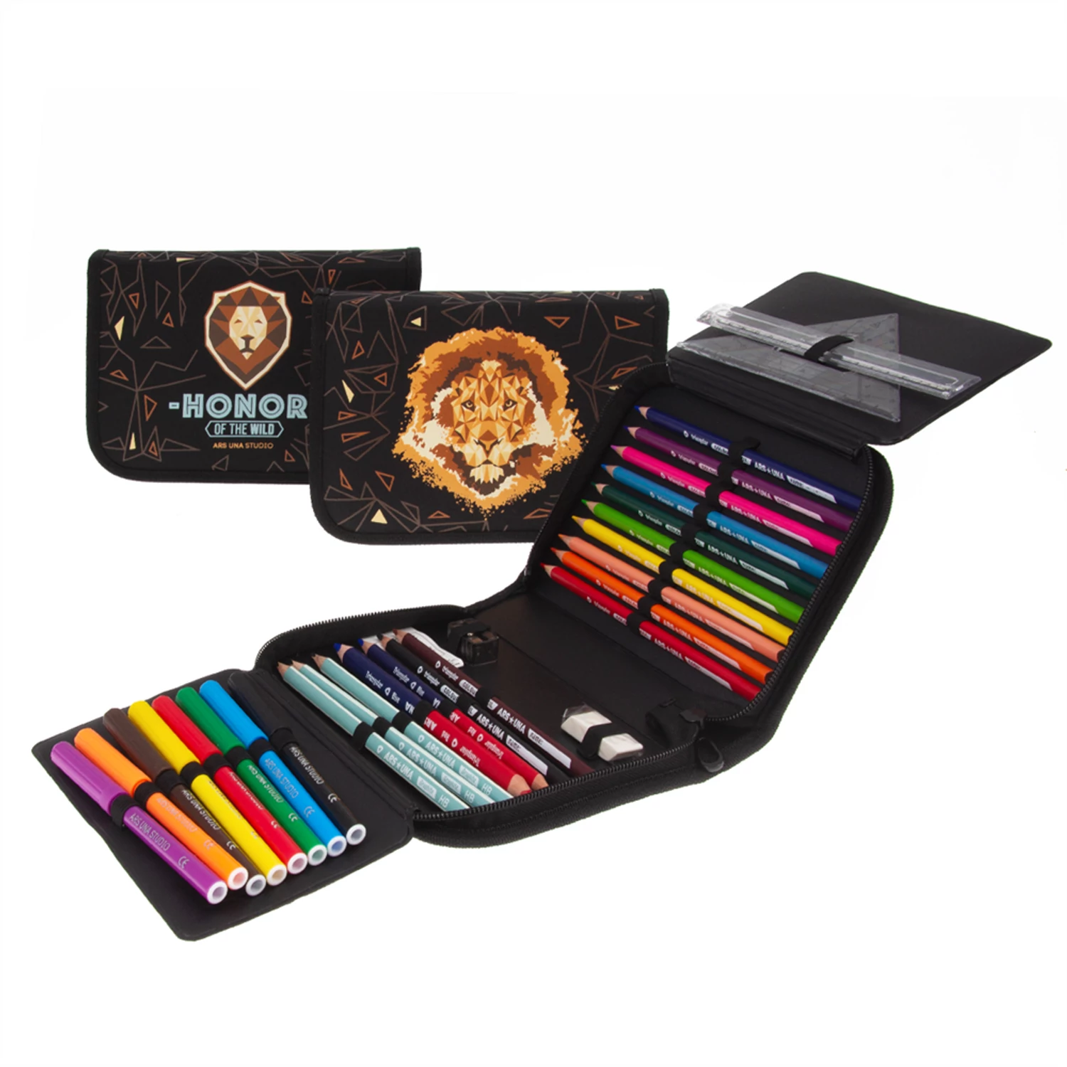 Írószerekkel töltött cipzáros tolltartó két kihajtható füllel, gumis kialakítással az írószerek tárolásához. Tartalma: 12 db színes ceruza, 3 db HB grafit ceruza, 1 vékony és 1 vastag postairón, 8 db színes filctoll, 1 db radír, 1 db hegyező, 1 db 17 cm-es egyenes vonalzó, 1 db háromszög vonalzó, órarend A és B hétre. Hiteles tájékoztatás: Elkötelezettek vagyunk termékeink biztonságának garantálásáért, nyomon követjük a termékbiztonsággal kapcsolatos valamennyi európai uniós és hazai szabályozást és biztosítjuk termékeink azoknak történő megfelelését. Az EU 2023/988-as számú Általános Termékbiztonsági Rendeletét (GPSR) is alkalmazzuk, így ha a termékeink biztonságát illetően fogyasztóként kérdése, észrevétele van, vagy esetleg balesetről van tudomása, kérjük, írja meg nekünk. GPSR: Ars Una Studio Kft., H-1113 Budapest, Csetneki u. 13.,webshop@arsuna.hu, https://arsuna.hu/