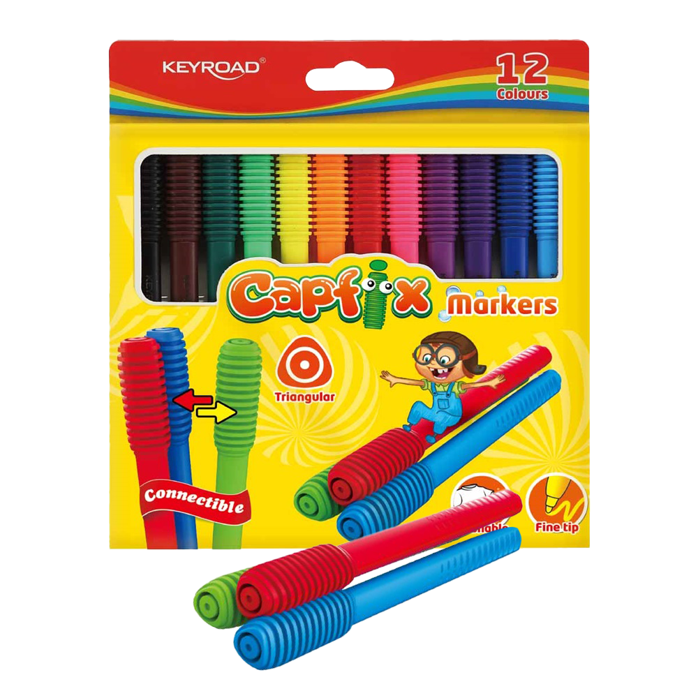 A Keyroad Capfix rostirón filctoll készlet 12 és 24 db-os verzióban vár készletünkön. Különlegessége, hogy a filcek kupakjai összekapcsolhatók egymással, így színezés előtt és után is remek szórakozást nyújthat a kisebbeknek. Univerzálisan használhatók, az ergonomikus, háromszögletű dizájnnal hosszabb távon is kényelmesen foghatók.