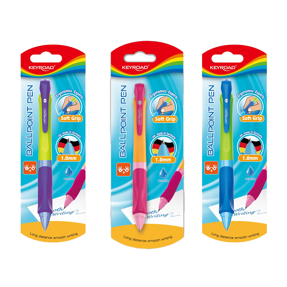 A magas, német minőségű, kék tintájú, 1 mm-es hegyű Keyroad golyóstoll vegyes színekben elérhető (kék-zöld, piros-narancssárga, lila-zöld). A puha és könnyed fogású íróeszközt jobb és balkezesek is egyaránt használhatják.
