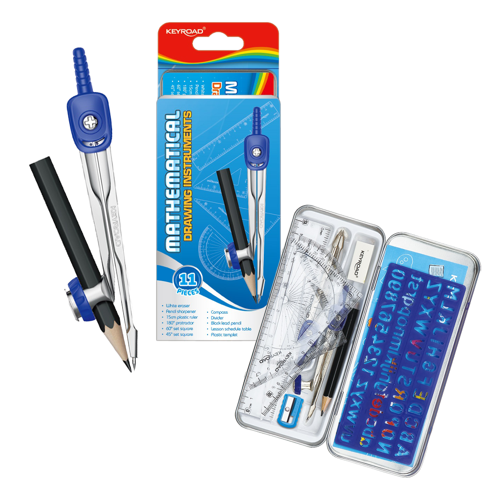 A Keyroad Math Box minden matekozó diák vagy tervező felnőtt számára kötelező darab! A készlet minden egyes darabja magas minőségű, tartós anyagból készült. A készlet tartalma: ceruzás körző, grafitceruza, fehér radír, hegyező, 15 cm-es vonalzó, derékszögű vonalzó, 60 fokos vonalzó, szögmérő, órarend, műanyag ABC séma, fém doboz