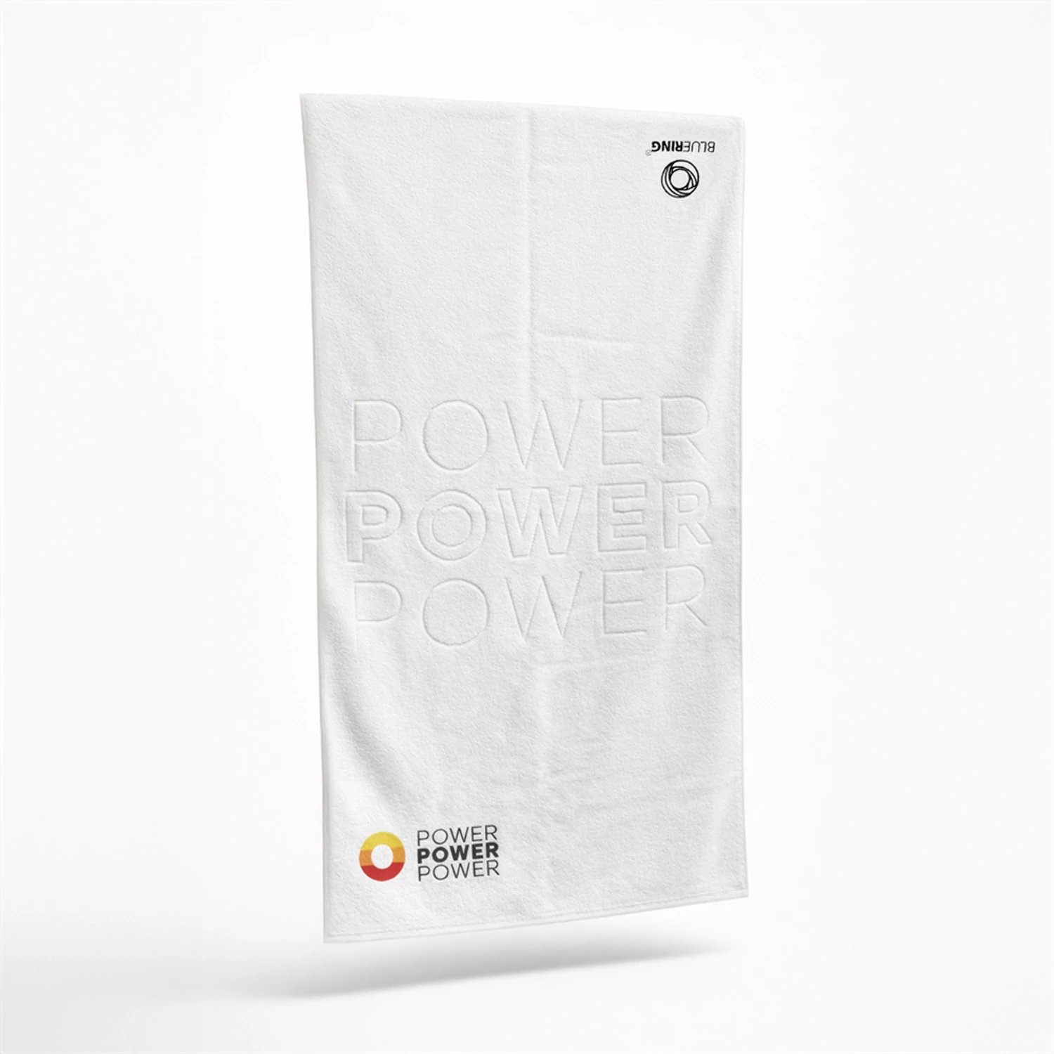 Fehér törölköző, amely 70 x 140 cm-es mérete ideális kéztörlőként vagy arctörlőként való használatra.