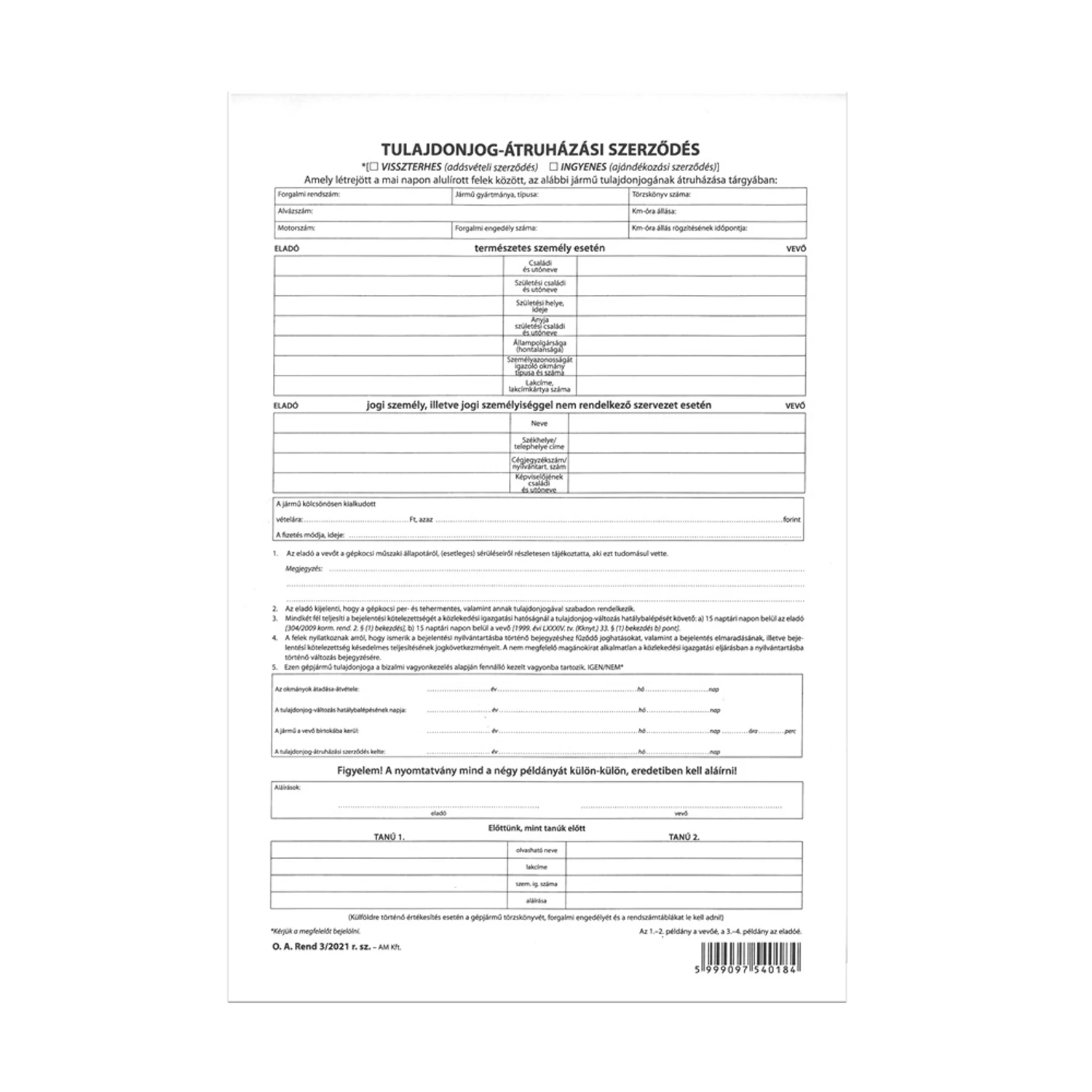Tulajdonjog átruházási szerződés, személygépkocsi adásvételi 4lapos garnitúra A.REND.3/2012