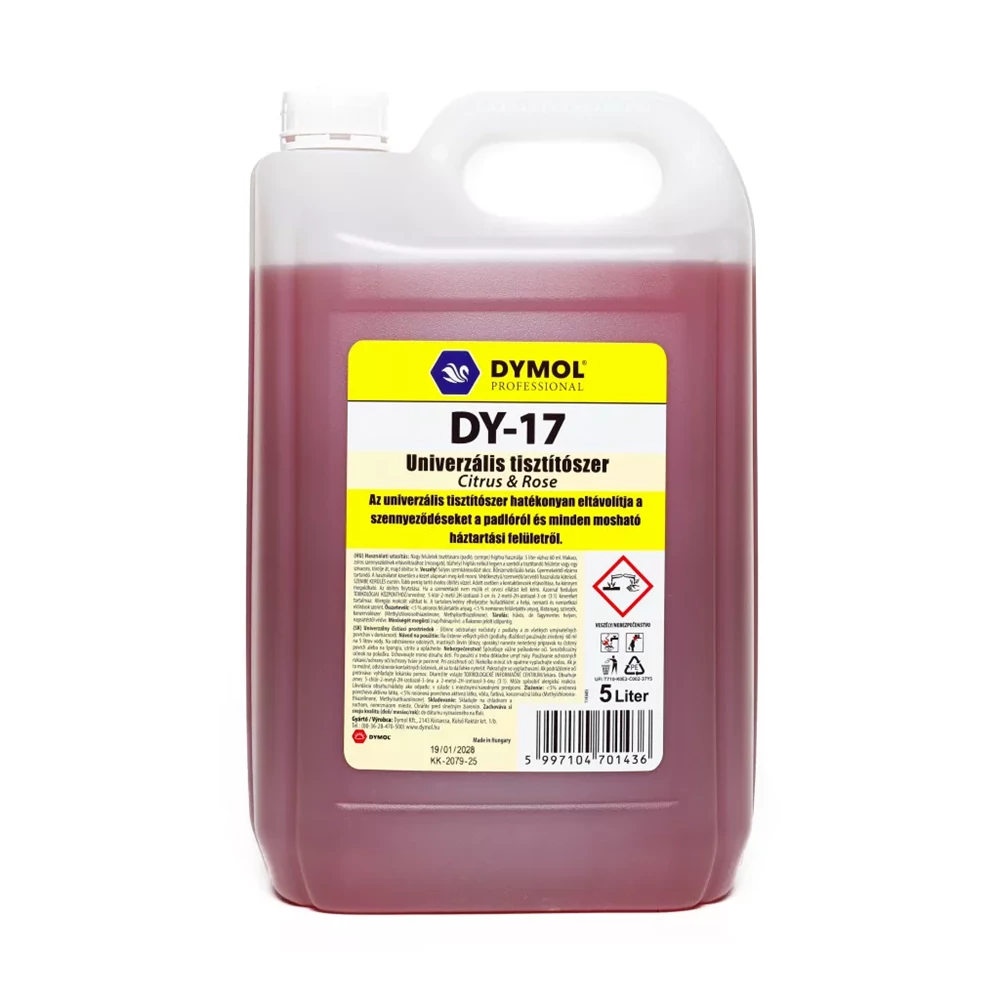 A tisztítószer hatékonyan távolítja el a szennyeződéseket minden mosható felületről, legyen ez akár a padló, a csempe, a munkalap, mosogató vagy a tűzhely. Ráadásul foltmentesen szárad, és friss illatot hagy maga után. Felhasználási ajánlat és adagolás: Nagy felületek tisztítására, felmosásra hígítva használja (5 liter vízhez 60ml). Makacs, zsíros szennyeződések (mosogatón, tűzhelyen) eltávolításához hígítás nélkül tegyen a tisztítószerből a tisztítandó felületre vagy egy szivacsra, törölje át, majd öblítse le. Összetétel: <5% anionos felületaktív anyag, <5% nemionos felületaktív anyag, illatanyag, színezék, konzerválószer (Methylchloroisothiazolinone, Methylisothiazolinone) GHS piktogram: Figyelmeztetés: Veszély Figyelmeztető mondatok: Szavatossági idő: 24 hónap Kiszerelés: 5 liter / kanna, 96 kanna / raklap Univerzális tisztító 5 liter DY-17 Citrus&Rose alkalmazásakor ügyeljen a biztonságra! Használat előtt mindig olvassa el a címkét és a használati útmutatót! Katalóguskód: 54518 Hiteles tájékoztatás: Elkötelezettek vagyunk termékeink biztonságának garantálásáért, nyomon követjük a termékbiztonsággal kapcsolatos valamennyi európai uniós és hazai szabályozást és biztosítjuk termékeink azoknak történő megfelelését. Az EU 2023/988-as számú Általános Termékbiztonsági Rendeletét (GPSR) is alkalmazzuk, így ha a termékeink biztonságát illetően fogyasztóként kérdése, észrevétele van, vagy esetleg balesetről van tudomása, kérjük, írja meg nekünk.