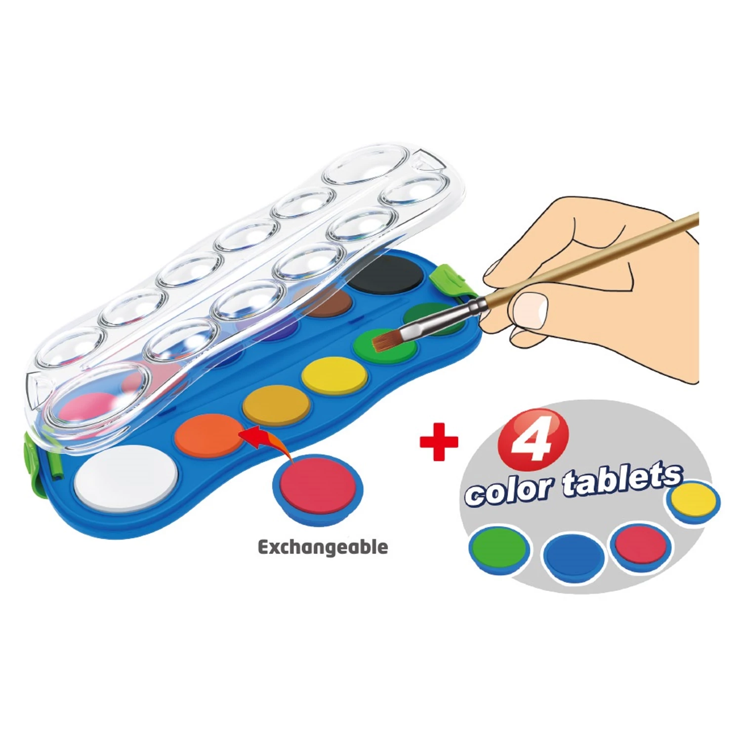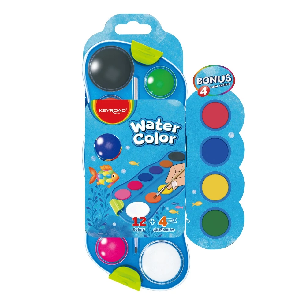 Vízfesték készlet, 12+4 cserélhető színnel, ecsettel, műanyag dobozban, Keyroad