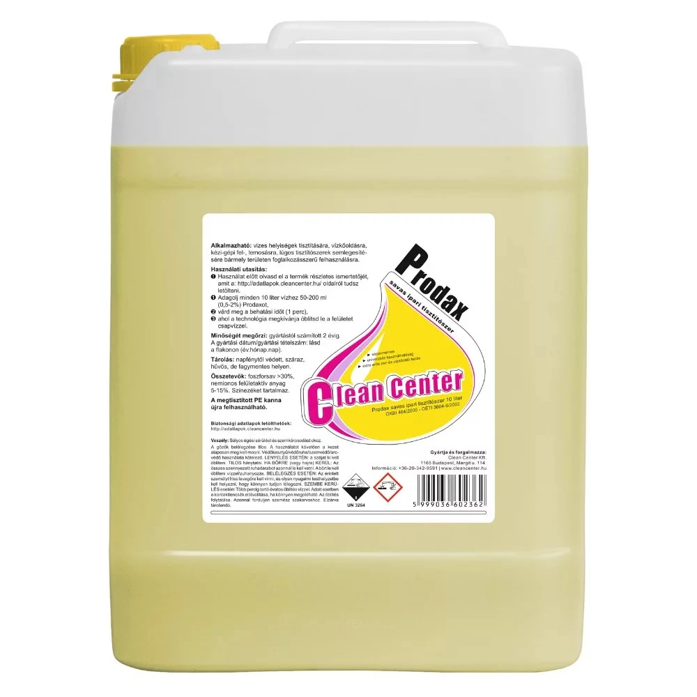 PRODAX savas ipari tisztítószer előnyei: Padló-és falfelületek napi és alkalmi vízkőmentesítéséhez, eszközök-és alkatrészek áztató vízkőmentesítéséhez egyaránt használható. Lúgos tisztítások után a padlón maradó csúszós lúgmaradványok semlegesítéséhez alkalmas. A Prodax savas ipari tisztítószer olyan felületaktív anyagokat és vízoldható oldószereket tartalmaz, melyek lehetővé teszik a zsírral fedett lerakódások eltávolítását is, amelyre a normál vízkőoldók nem alkalmasak. Extrém hatóanyag-tartalmú készítmény, több mint 70% foszforsav tartalommal. Szinte bármilyen vastagságú vízkőlerakódást képes eltávolítani. A sósav rendkívüli maró hatása nélkül távolítja el a vízkövet a felületekről. PRODAX savas ipari tisztítószer felhasználási területei: GHS piktogram: Figyelmeztetés: Veszély Figyelmeztető mondatok: Kiszerelés: 10 liter / kanna Vízkőoldó 10 kg Prodax termék alkalmazásakor ügyeljen a biztonságra! Használat előtt mindig olvassa el a címkét és a használati útmutatót! Katalóguskód: 61396
