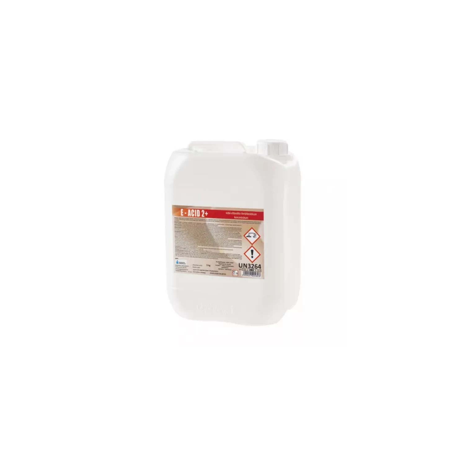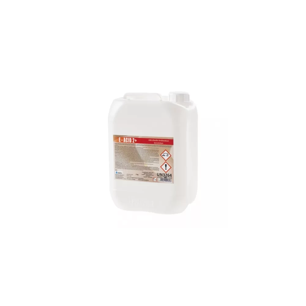 Folyékony, savas kémhatású, habzó vízkőoldószer. Elsősorban mész-, tej- és vízkőkiválások, valamint zsír- és fehérjeszennyeződések eltávolítására szolgáló emelt foszforsav tartalmú termék. Könnyen feloldja a makacs vízkőlerakódást, korróziós károsodást nem okoz a fémfelületeken, hiszen sósavat nem tartalmaz. A krómnikkel-acél, üveg, porcelán, alumínium, gumi és saválló műanyag szerkezeti anyagokat nem támadja meg. Alkalmazási terület: Az élelmiszeripar, vendéglátóipar területein, a betegellátó- és közintézményekben, konyhákban, stb. alkalmazható. Melegen tartó medencék, bojlerek, gőzpárolók, tea – és kávégépek, üstök, úszómedencék, zuhanyzók, fürdők, WC-k, mosdók, csaptelepek, csempék és saválló felületek tisztítására. Összetevők: Kiszerelés: 5 literes kanna GHS piktogram: Figyelmeztetés: Veszély Figyelmeztető mondatok: H318 Súlyos szemkárosodást okoz, H315 Bőrirritáló hatású A Vízkőoldó koncentrátum fertőtlenítő hatású 5 liter E-Acid 2+ alkalmazásakor ügyeljen a biztonságra! Használat előtt mindig olvassa el a címkét és a használati útmutatót! Katalóguskód: 54380
