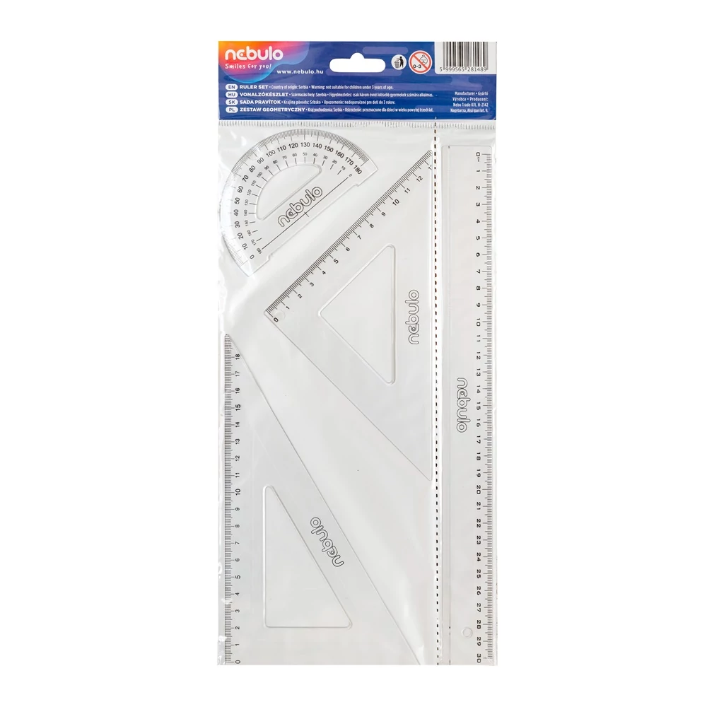 Iskolai vonalzókészlet jól olvasható számskálával. A készlet tartalma: 1 db 30 cm-es egyenes vonalzó; 1 db 60°-os, 18 cm-es számskálájú háromszög vonalzó; 1 db 45°-os, 13 cm-es számskálájú egyenlő szárú háromszög vonalzó; 1 db szögmérő. Katalóguskód: 27202 Hiteles tájékoztatás: Elkötelezettek vagyunk termékeink biztonságának garantálásáért, nyomon követjük a termékbiztonsággal kapcsolatos valamennyi európai uniós és hazai szabályozást és biztosítjuk termékeink azoknak történő megfelelését. Az EU 2023/988-as számú Általános Termékbiztonsági Rendeletét (GPSR) is alkalmazzuk, így ha a termékeink biztonságát illetően fogyasztóként kérdése, észrevétele van, vagy esetleg balesetről van tudomása, kérjük, írja meg nekünk. GPSR: Nebu Trade Kft. H-2142 Nagytarcsa, Alsó Ipari krt. 9.;lb@nebutrade.hu; https://www.nebulo.hu/